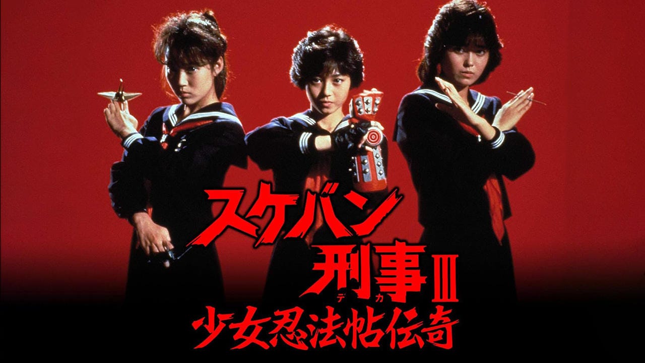 Sukeban Deka III (1986), más mamarracha y con ninjas. Aquí las protagonistas son un trío de hermanas kunoichi y se introducen más elementos de fantasía y folklore japonés: https://archive.org/details/sukeban-deka-iii